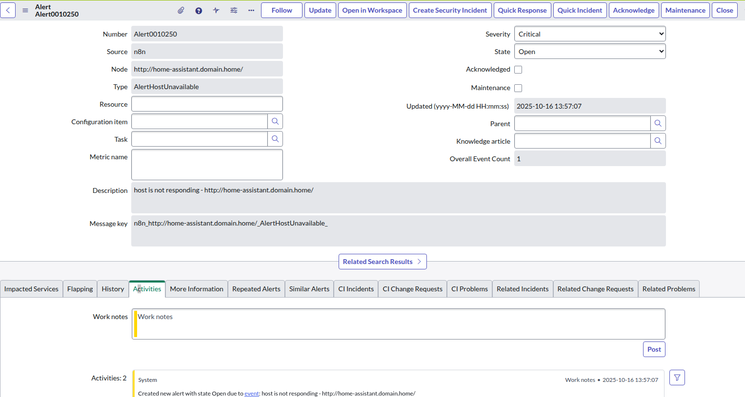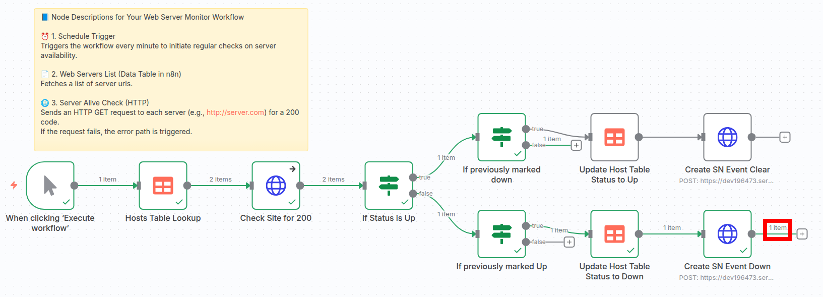 You can use n8n to build a custom monitoring solution. In the example below, I store a list of endpoints in a table within the n8n instance. When the workflow runs, it checks each endpoint, and if it doesn’t return a 200 response code, the workflow marks the host as down in the table and sends a request to the ServiceNow Event API; https://instance.service-now.com/api/global/em/jsonv2, with a JSON payload to create an event. When the endpoint comes back online, a clear event is sent to ServiceNow.